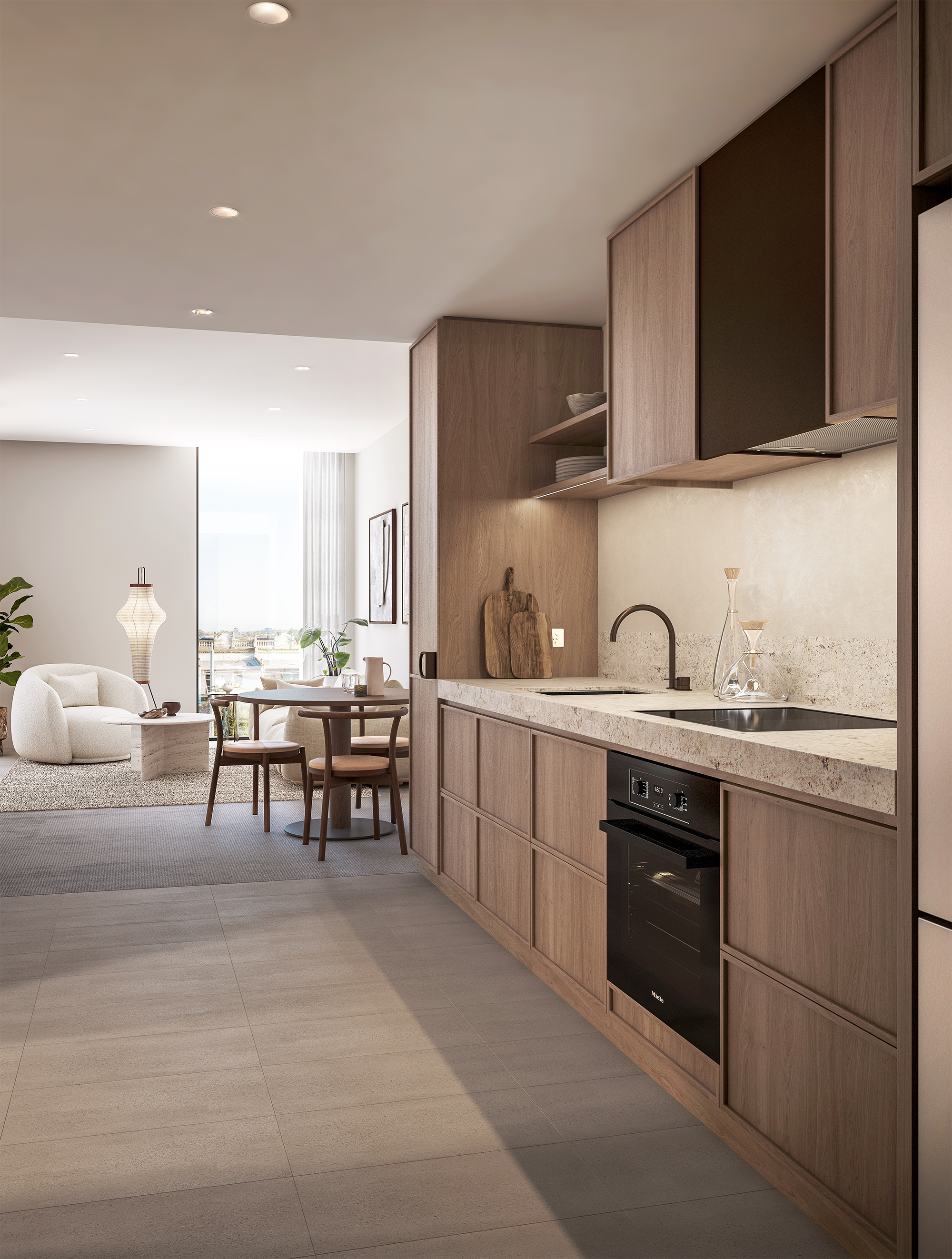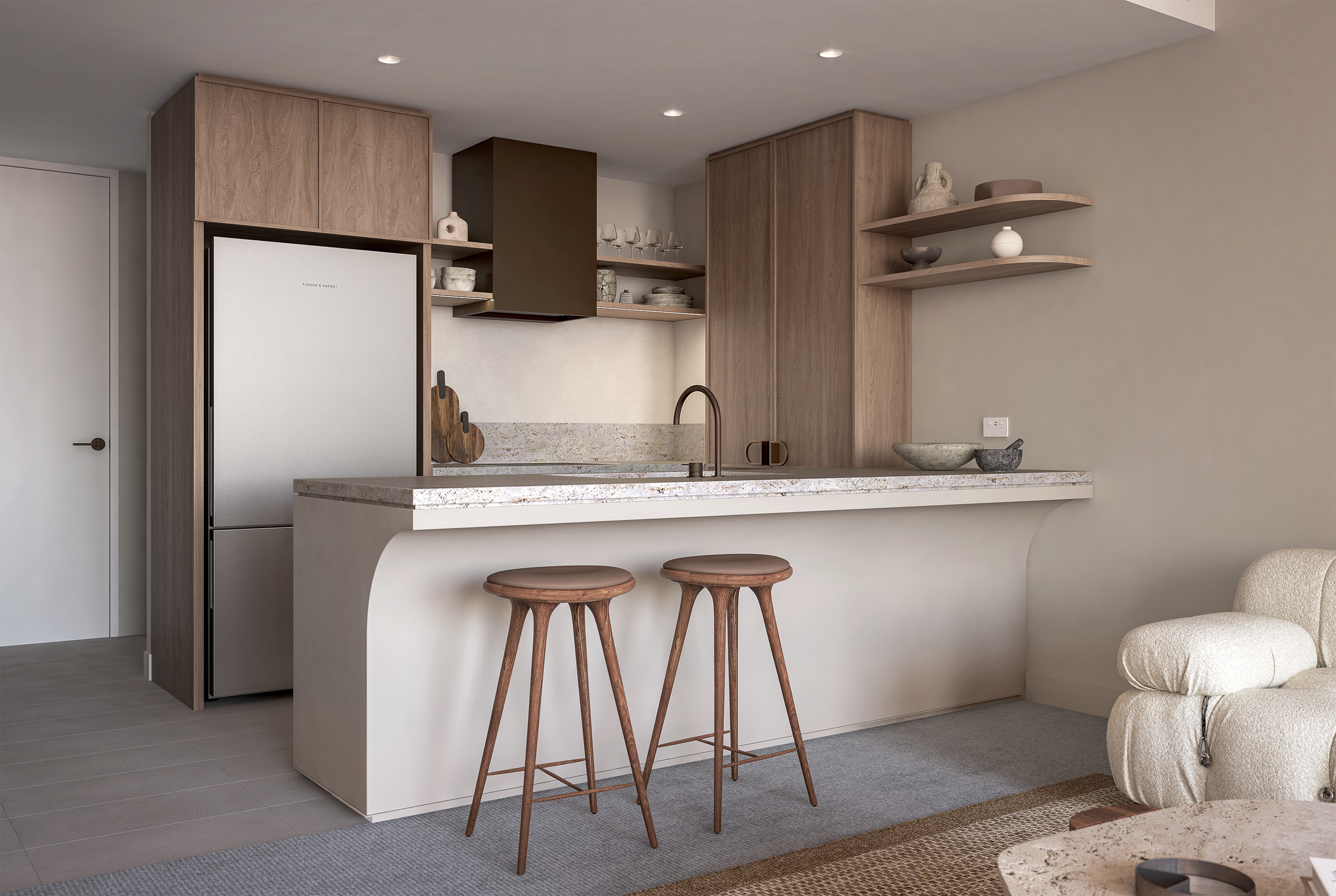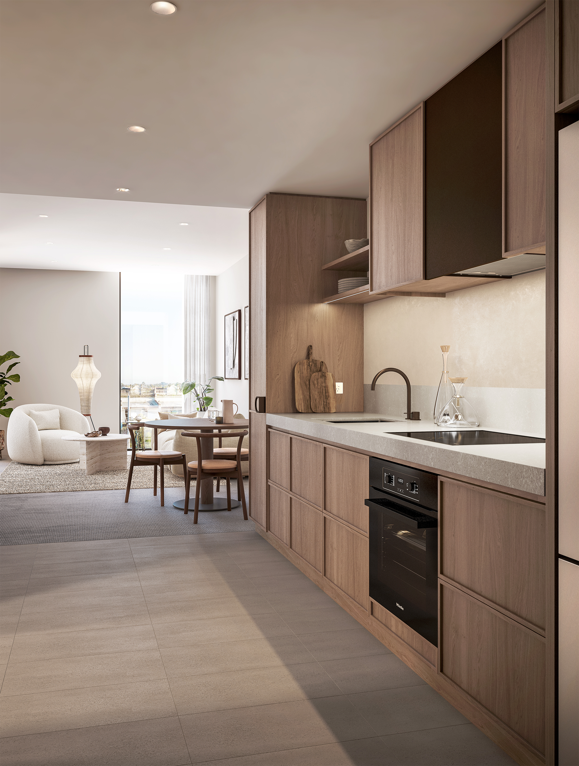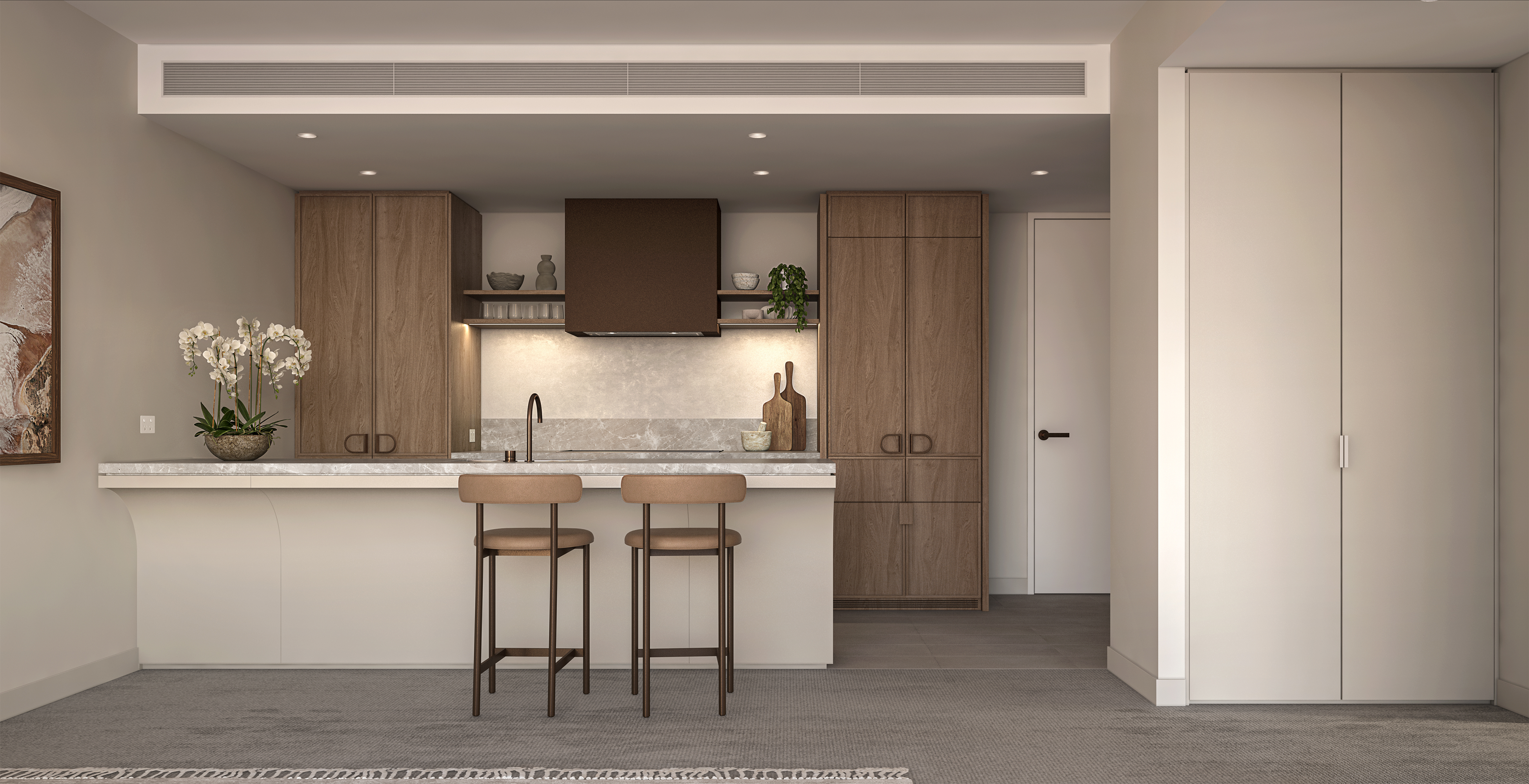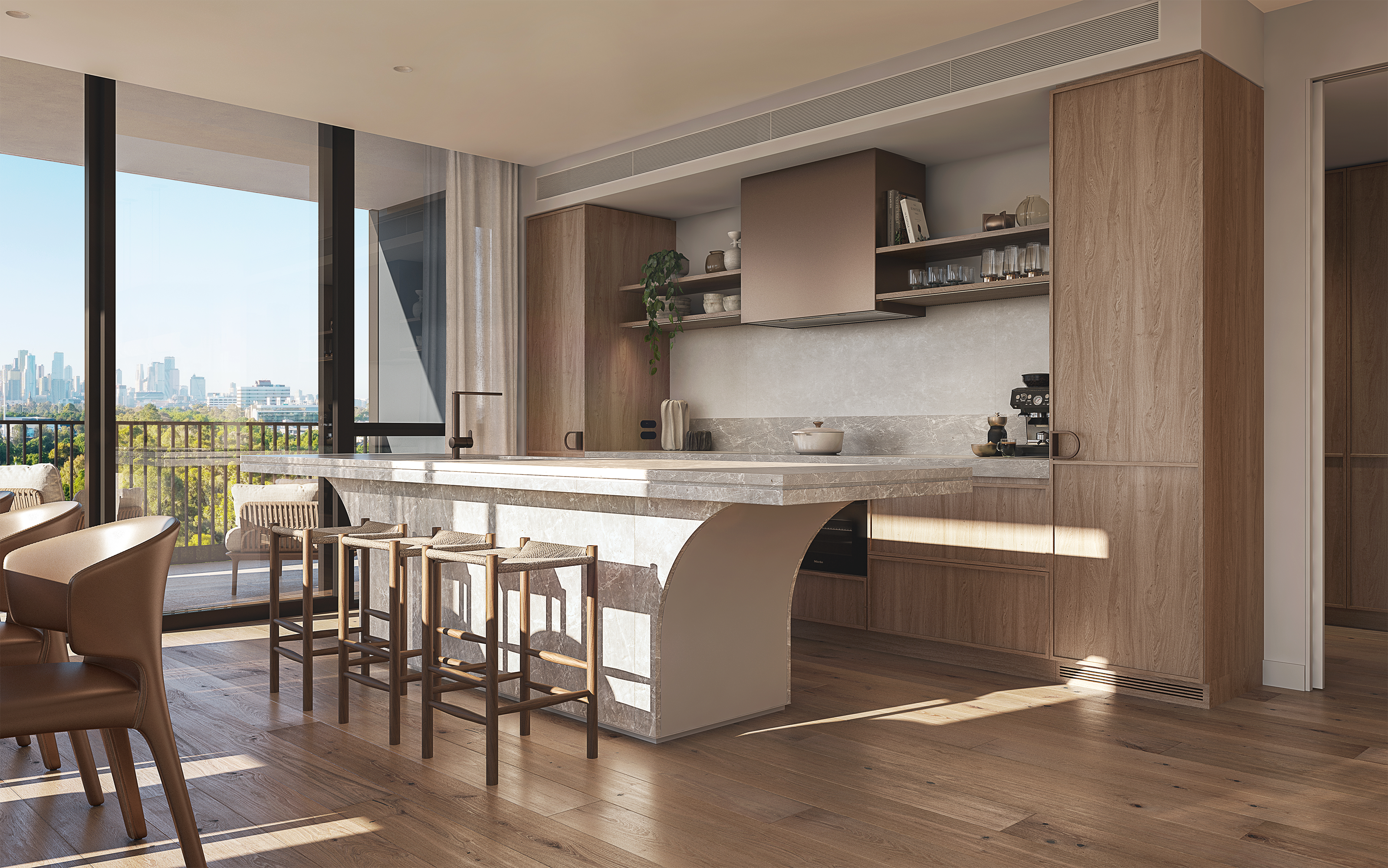 Cupboard with timberlook laminate, shaker profile and custom handle and desk