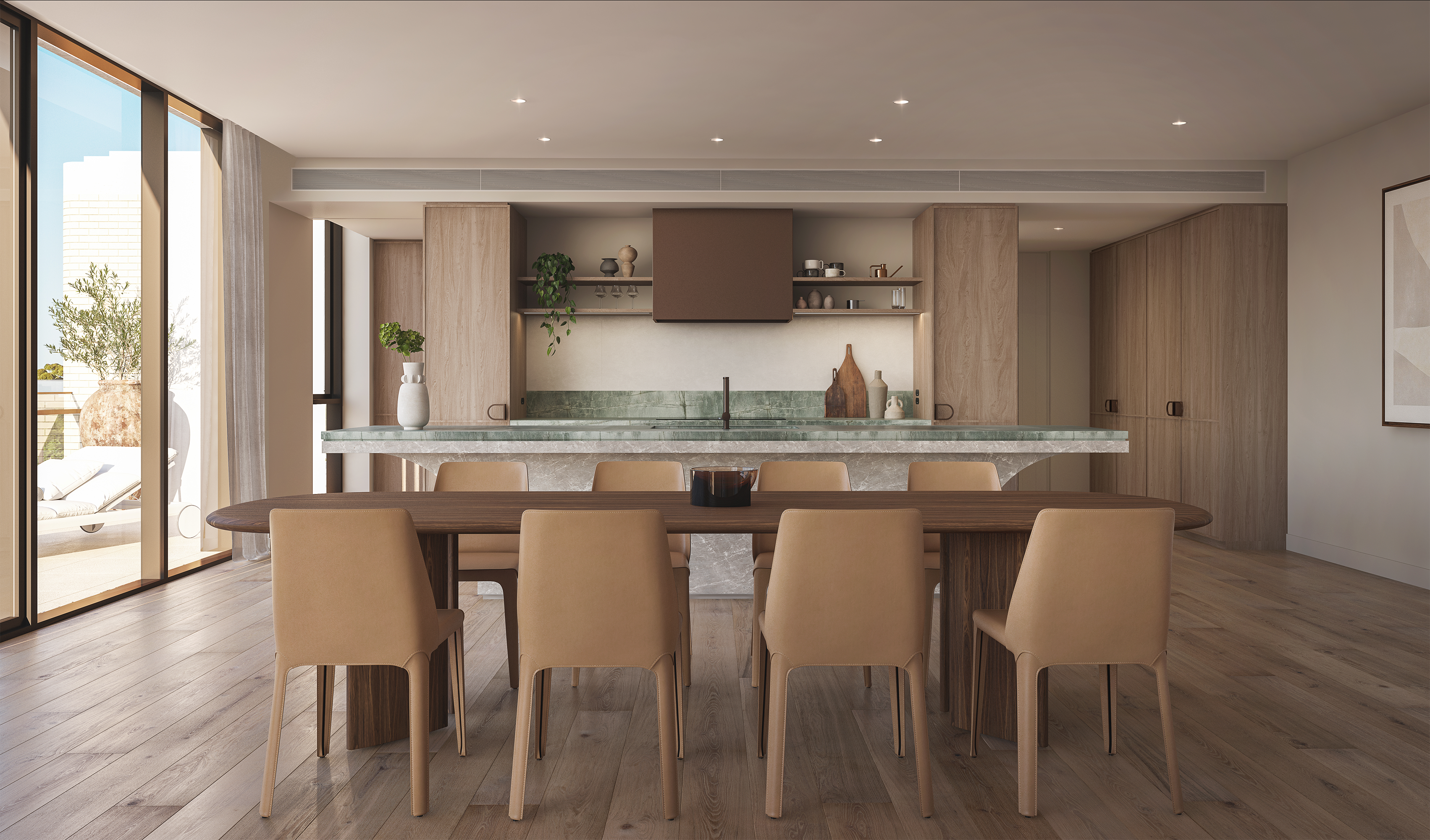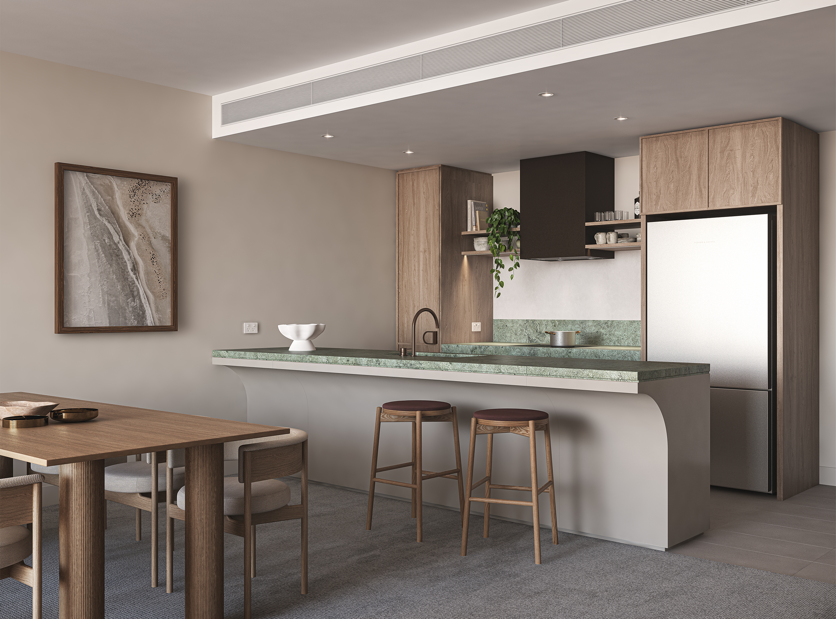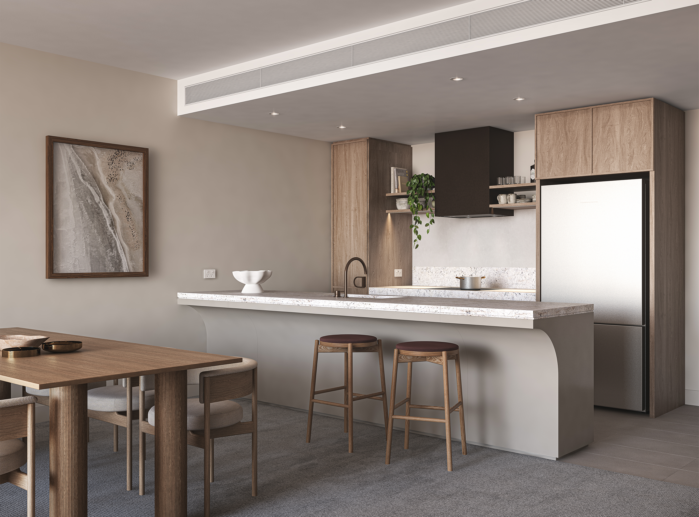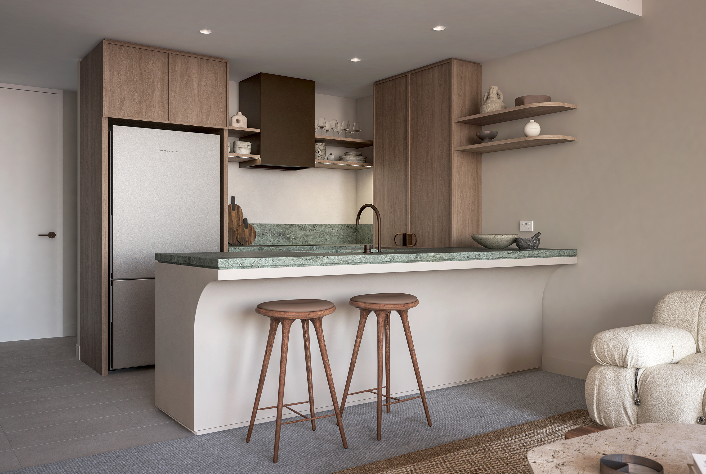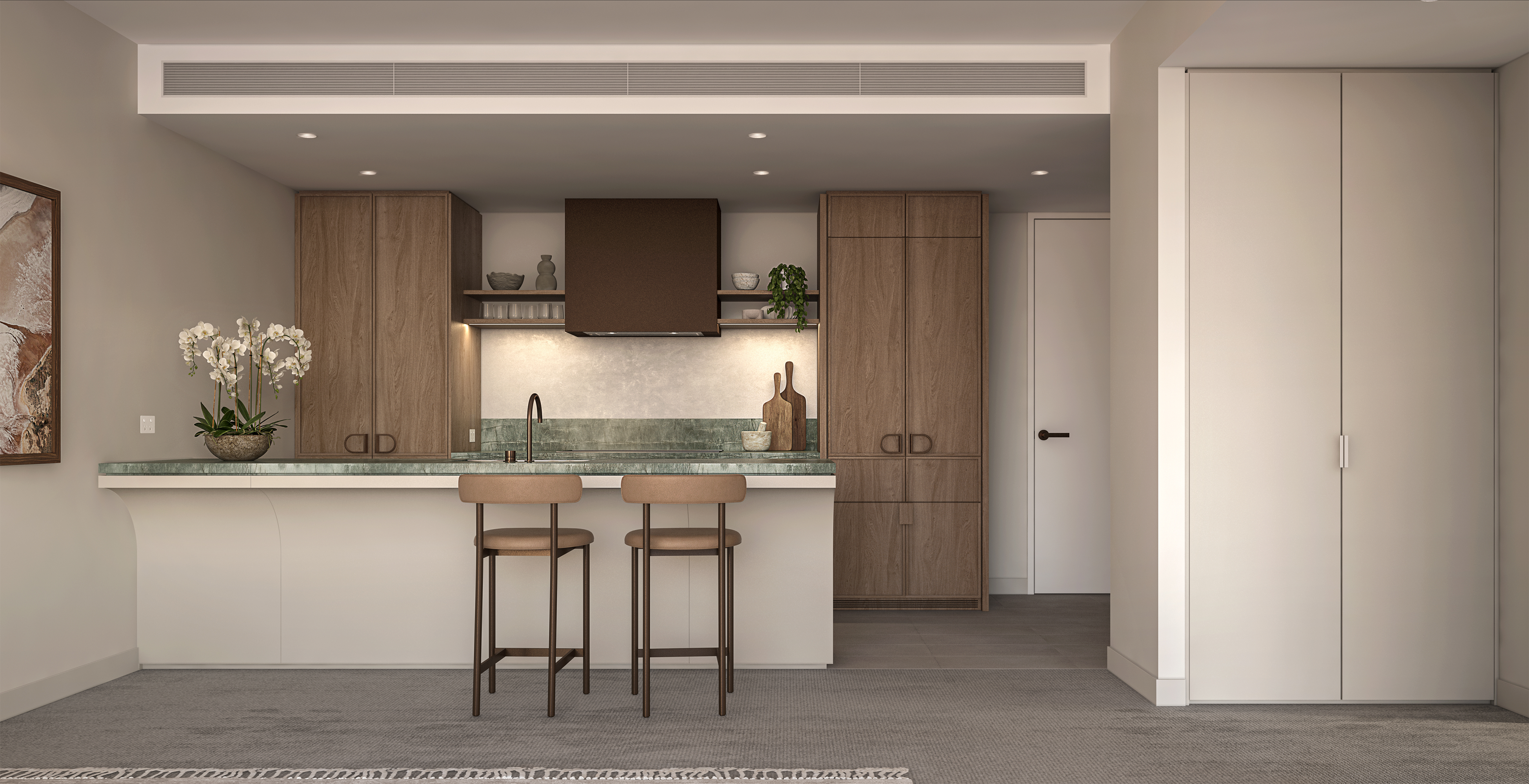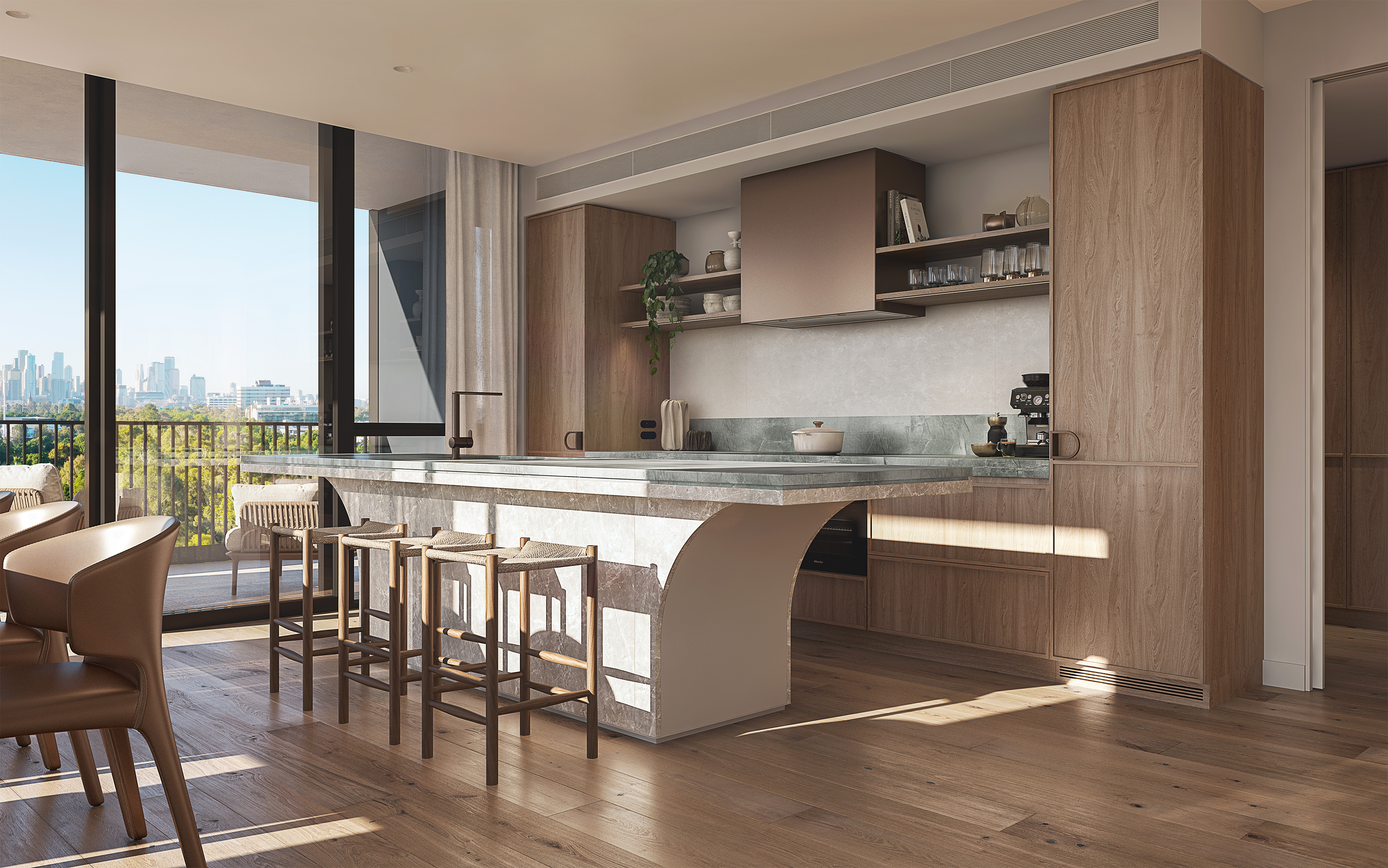 Cupboard with timberlook laminate, shaker profile and custom handle and desk